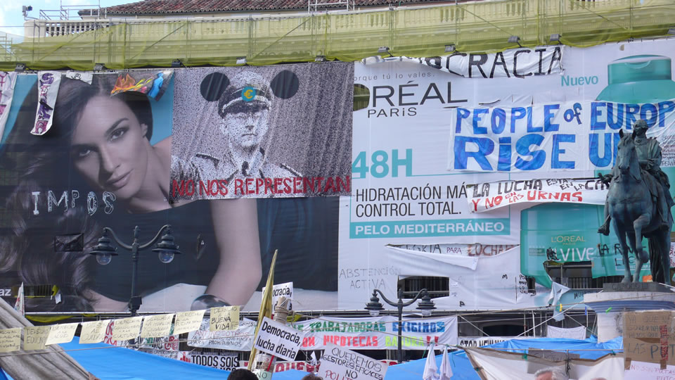 The subprime mortgage crisis in the USA in August 2007 triggered the end of the Spanish property bubble (1997-2007), initiating a process of economic convulsion and collective dispossession in Spain. To deal with the economic disaster, the PSOE Government (Spanish Socialist Workers’ Party), pushed by the European Central Bank (ECB), the European Union (EU) and the International Monetary Fund (IMF), began re-capitalizing the banks and financial institutions hit by the crisis. But the crisis could not be contained: the Spanish economy – and the so called ‘Spanish miracle’- had been based on an abnormal growth in property prices, household debt and the easy flow of credit. The subsequent contraction of credit put an end to Spanish society’s artificial dreams. Following the public bail-out of several banks, the PSOE Government implemented austerity measures with one main objective: to save the national banking structure at all costs, despite Spanish sovereign debt with the ECB and the inhumane destruction of social rights (now reformulated as ‘excessive spending’). The consequences of the austerity measures are well known in the southern countries of Europe: the rescinding of workers rights, the compression of wages, privatization of public health care, destruction of social services and enormous unemployment rates. Finally, on May 15th 2011, a wide popular protest erupted in Madrid, the capital city of Spain, to contest this neoliberal rule. These protests were different from previous ones, they were special: they started a new wave of collective struggle and solidarity unparalleled in the short history of Spanish democracy.
